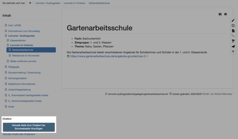 Wenn die Schule den öffentlichen Chatbot auf der Schulwebseite verwendet, könnt ihr einzelne Seiten für den Chatbot auf der Schulwebseite bereitstellen. Die Inhalte der Seite werden dann als Wissensbasis für den Chatbot genutzt.