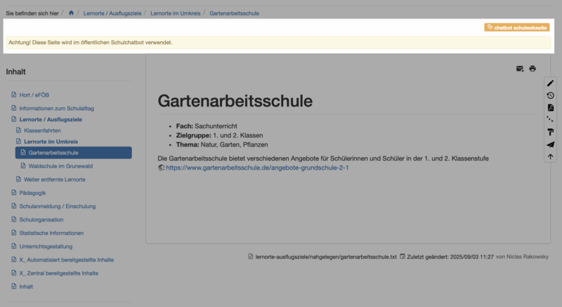 Achtung: Nutzt diese Funktion nur für Inhalte, die für die Öffentlichkeit gedacht sind! Die Inhalte der Seite stehen anschließend zur Abfrage über den Chatbot auf der öffentlichen Schulwebseite zur Verfügung!