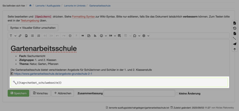 Falls eine Seite nicht mehr für den öffentlichen Chatbot zur Verfügung stehen soll, kann sie wieder entfernt werden. Hierzu muss die Seite editiert werden und die folgende Zeile entfernt werden: