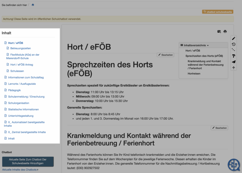 Nach der Anmeldung seht ihr auf der linken Seite eine Seitenleiste (Inhalt). Diese Leiste ist das zentrale Inhaltsverzeichnis unserer Wissensdatenbank.