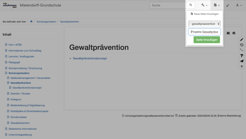 - Überlegt euch einen passenden Titel für euren neuen Artikel, z. B. „Projekte Gewaltpräventation“ und klickt auf „Seite hinzufügen“